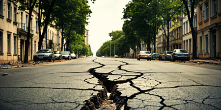 Urban Street Scene: Long Crack in Road Revealing Earthquake's Impact. AI