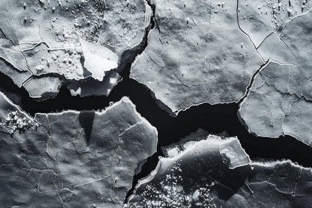 Aerial view of broken ice sheets on a frozen surface, showcasing a natural abstract pattern