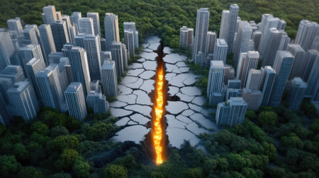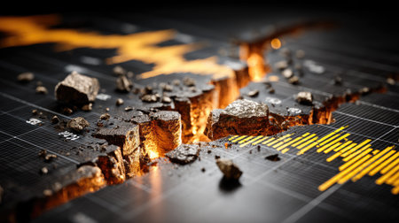 An image depicting the aftermath of an earthquake, showcasing the earths surface fractured and damaged.