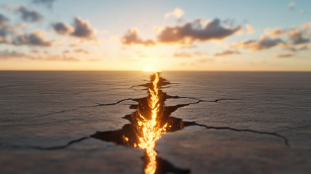 Extreme view focused on a wide, deep crack running through dry, parched ground, likely the result of severe drought or water depletion, set against a backdrop of a soft, warm sunset over a distant body of water and low horizon.