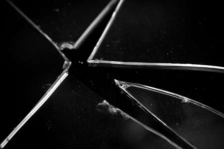 A close-up view of broken glass fragments showcasing intricate patterns and textures. The interplay of light and shadows creates an abstract visual effect, highlighting the fragile beauty of the shattered surface.