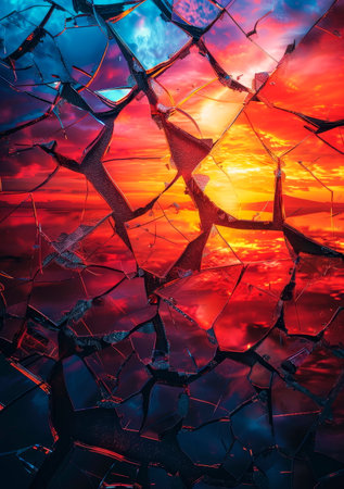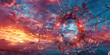 Cracked and shattered glass with metallic shards, reflecting a fiery sunset. Generative AI