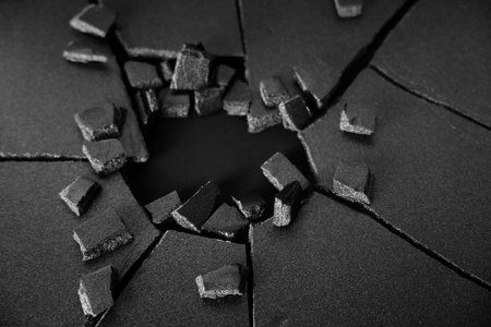 Moody shadows cast against the reflective surface of a broken mirror. Black and white art.