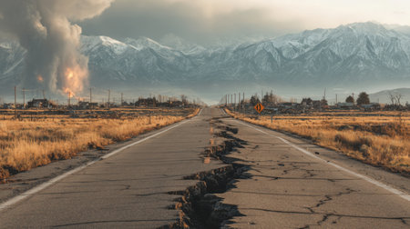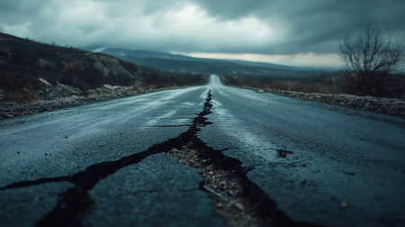 Fractured asphalt roadway revealing earthquake damage amid rugged mountain terrain, dark clouds highlighting intense geological forces transforming landscape