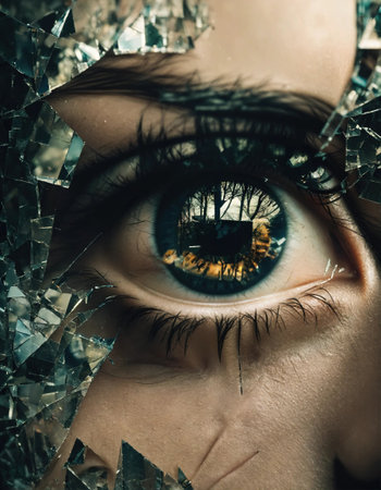 Detailed view of an eye seen through shattered glass, conveying a sense of fragility and vulnerability