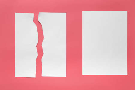 Ripped Sticky Note With Important Messages Presented On Desk. Teared Apart Memo With Two Different Crutial Informations. Recent Announcements Presented.