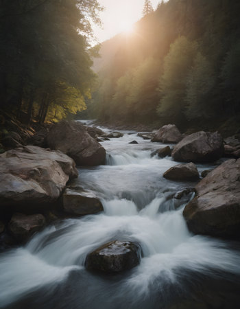 A peaceful morning scene depicting a serene river surrounded by trees, with mist rising off the water's surface, creating a tranquil and enchanting atmosphere.