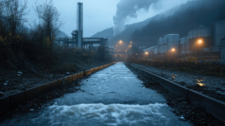 A polluted river with industrial waste and smoke at sunset