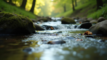 Gentle stream running nearby its soft babbling adding to nature's calming symphony , Professional stock photo, AI generated photograph