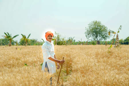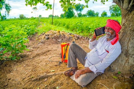Indian farmer talking mobile phone at Agriculture field