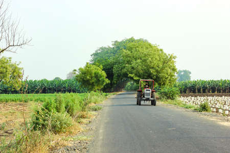 Indian farmer driving tractor on road