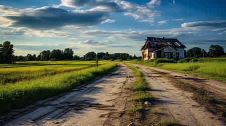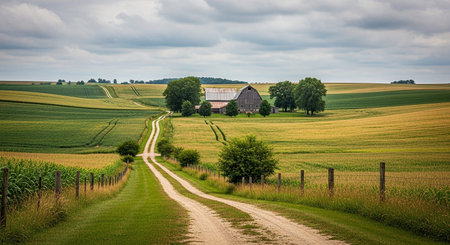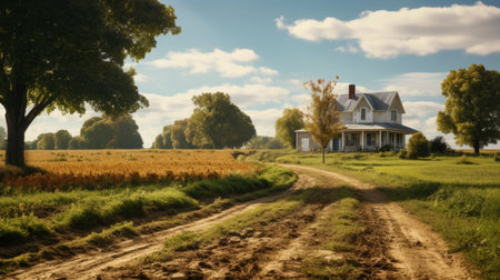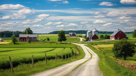 In the midst of a remote countryside the winding road stretches on passing by quaint villages and picturesque farms showcasing the . AI generation