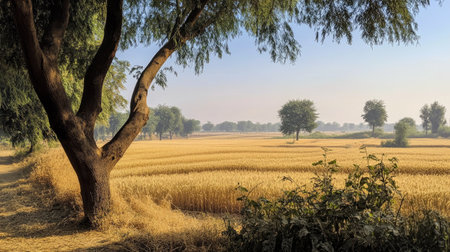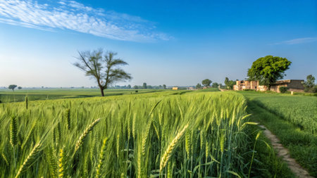 Morning sun rising over endless wheat fields in Punjab, warm golden hues and fresh air generative ai
