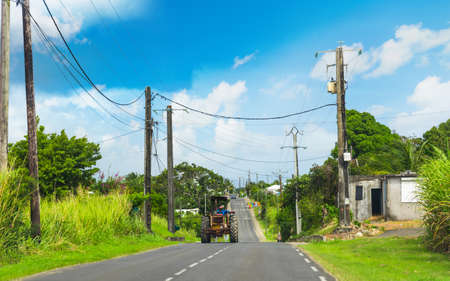 Tractor on a picturesque country road in Guadeloupe, Caribbean