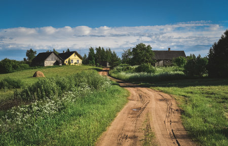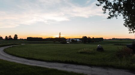 Beautiful summer landscape countryside at sunset. Path to the village. Great holiday home in the countryside. Evening