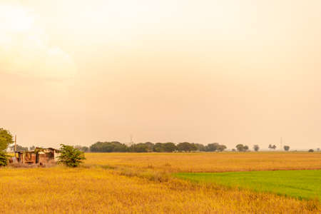 Landscape of rice farm field with sunrise light in the morning. Trees and old hut with dry straw bales in a harvested rice field and grass flower. Agricultural field. Hay stack for animal feed.