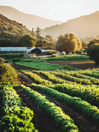 Fresh organic produce is being harvested for delivery on a vibrant farm, illuminated by warm sunlight and surrounded by lush greenery.