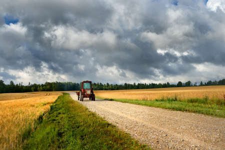 tractor on the road and cereal field against dark stormy clouds