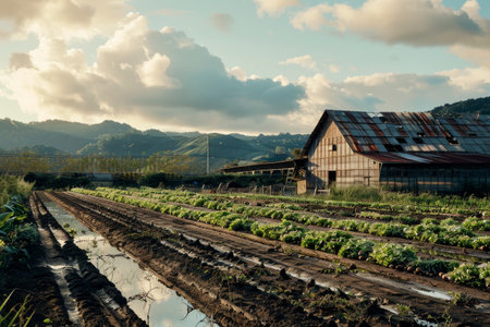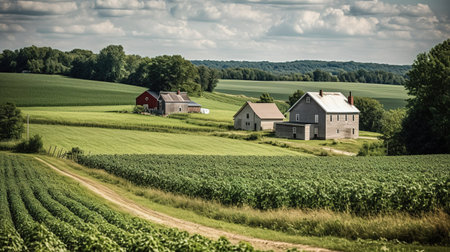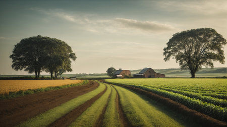 An AI generated illustration of a scenic rural landscape with a lush green farm