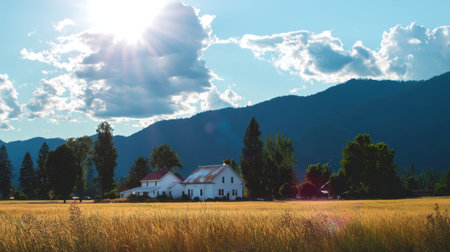A picturesque landscape featuring a charming white house amidst a golden field under a vibrant blue sky. Radiant sunlight bathes the serene scene, creating a peaceful atmosphere.