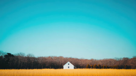 Tranquil rural landscape featuring a single white house nestled in a field of tall, golden grass, with a backdrop of leafless trees under a clear, vibrant blue sky. The scene evokes a sense of peace and solitude.
