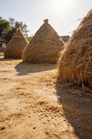 Straw stacks with coconut palms in the background - A typical Indian rural scene