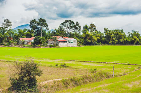 Rice field green grass blue sky cloud cloudy landscape background, Vietnam