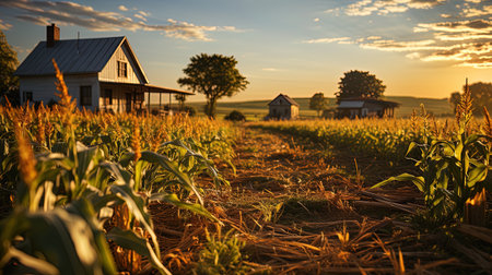A farm with a barn and corn field. Generative AI.