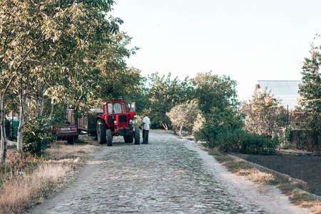 A red tractor stands by the road in the countryside. A man with a foot stands near a tractor