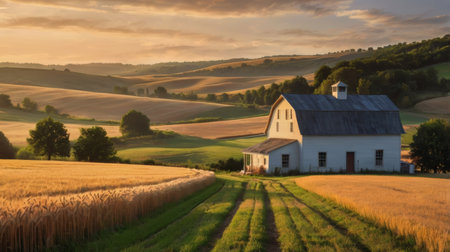 A serene landscape captures a golden wheat field with a white barn nestled beside it. The sun sets, casting a warm glow over the scene, with rolling hills in the background.