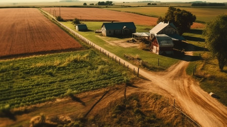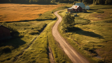 Aerial image of a dirt road near a farm. Generative AI