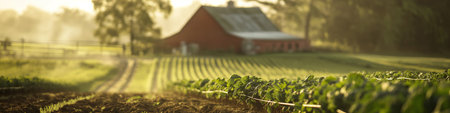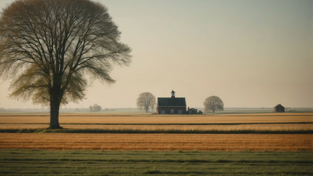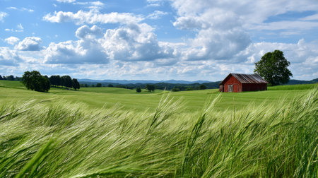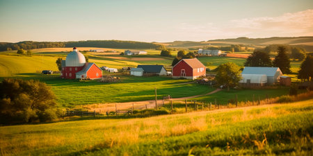 peaceful countryside Labor Day background featuring farms, barns, and rolling hills, illustrating the importance of agriculture and rural communities in our society.