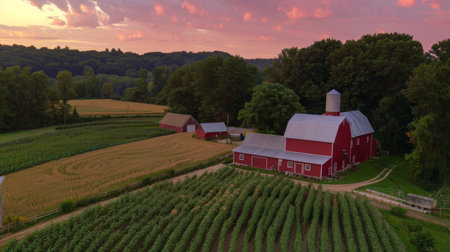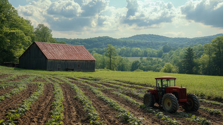 A bright red barn stands next to a tractor working the fertile soil of a spacious farm. Green fields stretch under a clear blue sky, showing the beauty of rural life.