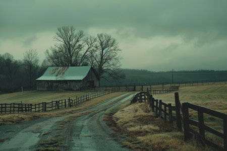 scenic dirt road between rustic barns on a beautiful farm