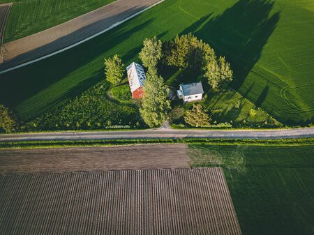 Aerial view of farmland with red barn and houses and harvest field in rural Finland