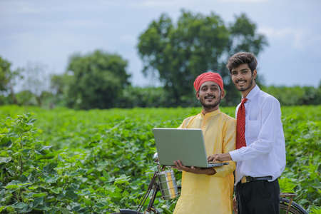 Young indian agronomist showing some information to farmer in laptop at cotton field