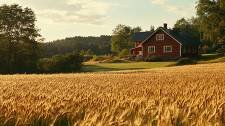 A peaceful countryside scene showcasing a vibrant red house nestled in golden wheat fields, framed by lush greenery and a tranquil sunset sky, ideal for nature lovers.
