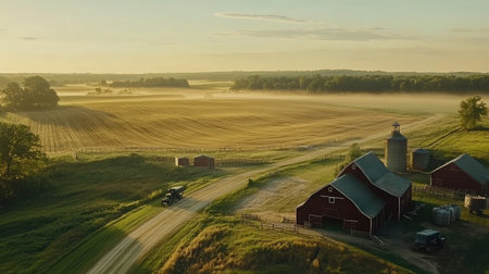 Morning mist over a rural American dairy farm with red barns and empty paddocks