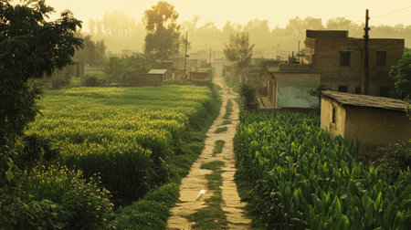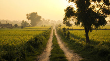 Path between lush green farms in Punjab, bathed in the golden light of an early sunrise generative ai