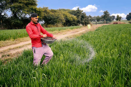 Indian farmer applying manure to increase fertilizer capacity in wheat field