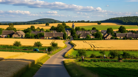 A scenic rural landscape with a winding road leading through fields of green and yellow crops. Houses and a church are visible in the distance, surrounded by trees. The blue sky with white clouds adds to the natural beauty of the scene, creating a sense of serenity and peacefulness.