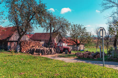 Country landscape: wooden houses with a tiled roofs, a tractor and firewood on green grass.