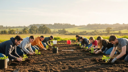 An AI generated illustration of a group of people working on a farm at sunset
