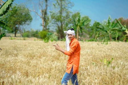 indian farmer in orange shirt and white hat standing in wheat field
