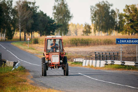 Malyye Avtyuki, Belarus - September 9, 2016: Tractor In Motion On Country Road.