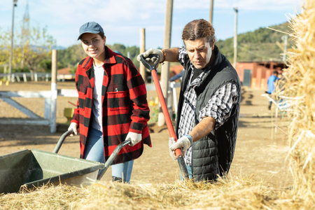 Man and woman gather hay together to feed the horses in the stable