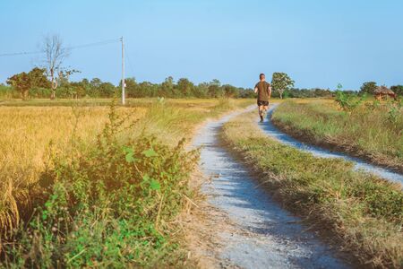 Back view of man running and exercising on the path through the rice fields in the evening.