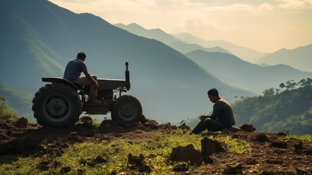 Farmer working on tractor in the field at sunset, Thailand.