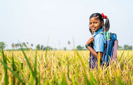 happy smiling school girl kid looking camera while standing at paddy field in unifrom showing with copy space - concept confident, education and back to school.
