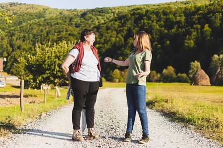 Mother and daughter talking while walking in nature on a summer day – Pretty old lady and girl feeling relaxed outdoors – Concept image for healthy lifestyle